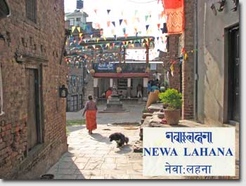 They have planned and realized an Open Air museum which stretches along the narrow lanes where not only the old tools and appliances are displayed but where also historic rites and customs are explained in a vivid manner. The cooperative also takes care for frequent cleaning of lanes and paths as well as for waste disposal (not quite self-evident for other villages in Nepal). The cooperative keeps historic rites and customs alive and takes care for the most needy persons by raising some small contributions for their support. An open-air (Newar-) restaurant has been erected on the top of the central prayers hall based on the financial contribution of all families in the tole. Exclusively Newar food, prepared by the inhabitants are served in the restaurant called "Newa Lahana" - meaning 'Newar culture'. Since 2008 the restaurant is extremely well received by the people of the Kathmandu Valley. The profit of the restaurant is for the benefit of the families of the tole. |