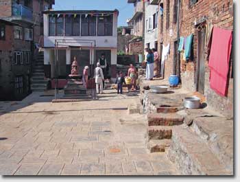 The neighbourhood-cooperative "Thambahal" The core village Kirtipur is divided into 12 neighbourhood districts, the so called toles. The inhabitants of a tole are are in habit of a special feeling of solidarity. They gather for religious ceremonies and activities at central places. In 2006 about 160 families of Thambahal tole have joined forces in a cooperative at the suggestion of some socially engaged citizens in order to develop their district into a classic example of Newar culture. |