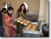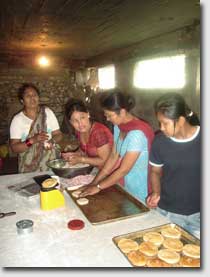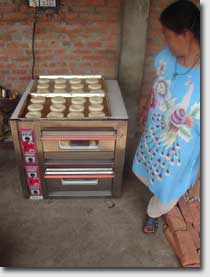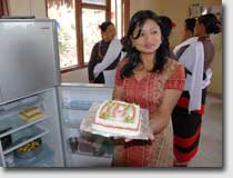 Lahana" Two elder men from Thambahal are helping to deliver the bakery products to the customers. It is considered to employ one more man to sell the products also on the campus of the near by Tribhuvan University. On request the women are also producing nice birthday cakes. The bakery is managed together with the restaurant and the Open Air Museum by a cooperative committee consisting of 11 inhabitants from Thambahal, 5 of them are women, one is employed in the bakery. Even in 2008 some women have learned in an other seminar the making of non-perishable cookies. This was to extend the range of products of the bakery. It is also planned to establish a little shop in Thambahal to sell the bakery products. |