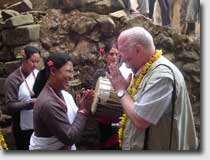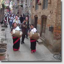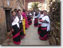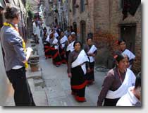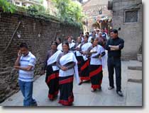 At the entrance of the tole the women welcomed their guest dressed in their traditional hand-woven black Newar-saris with the typical red seam. The shirts are hand-woven as well showing a design that is only used in Thambahal tole. The men and boys from the neighbourhood were watching to the ceremonies with great interest when the guest was solemnly receiving the puja and a garland of flowers. |