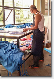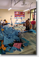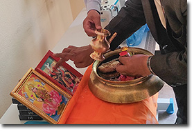 The puja ceremony takes place before the official inauguration speeches. The object of Puja worship is the divine, in this case framed, colourful representations of the gods, which will surely find their permanent place in the future workshop. |